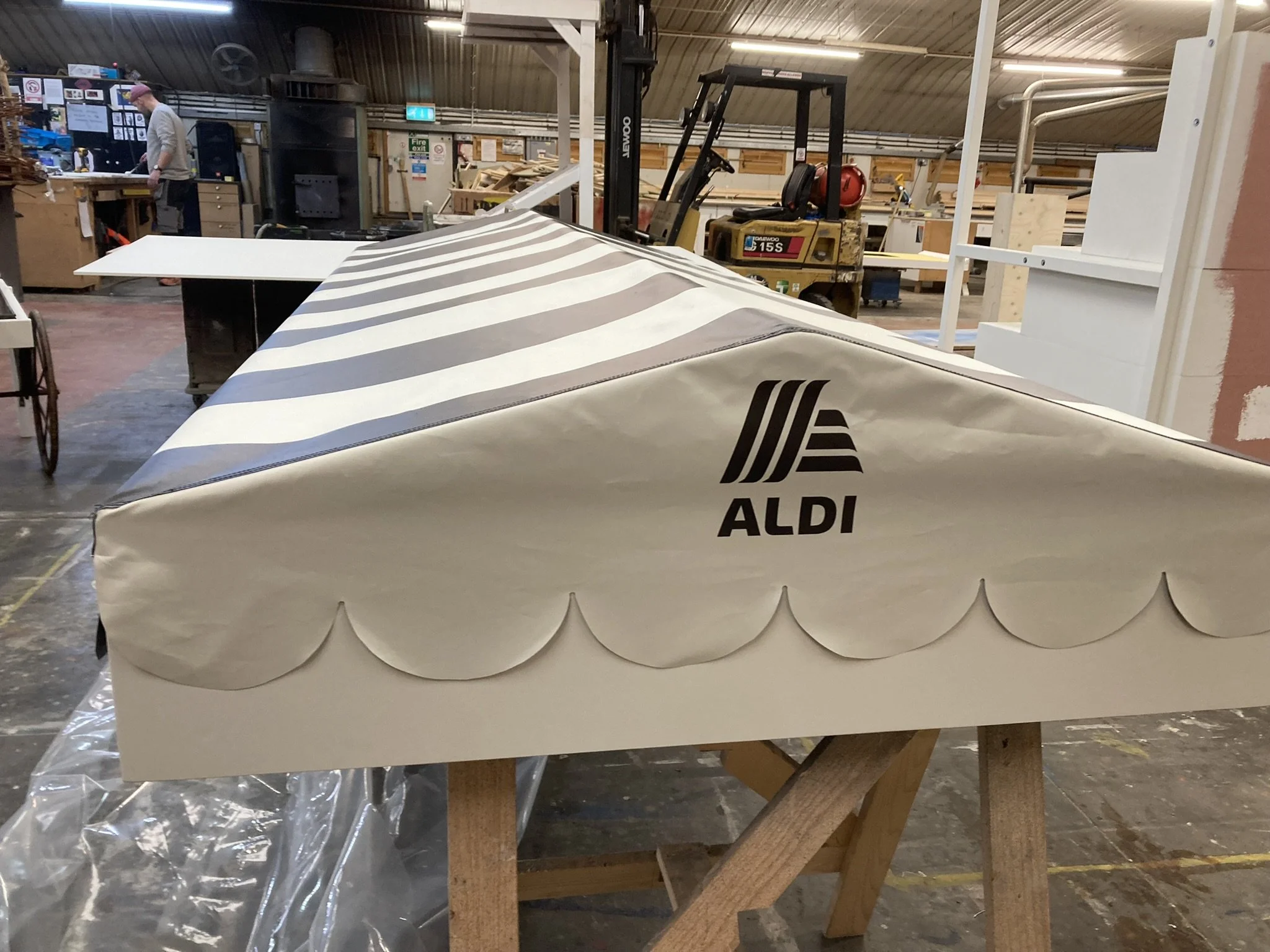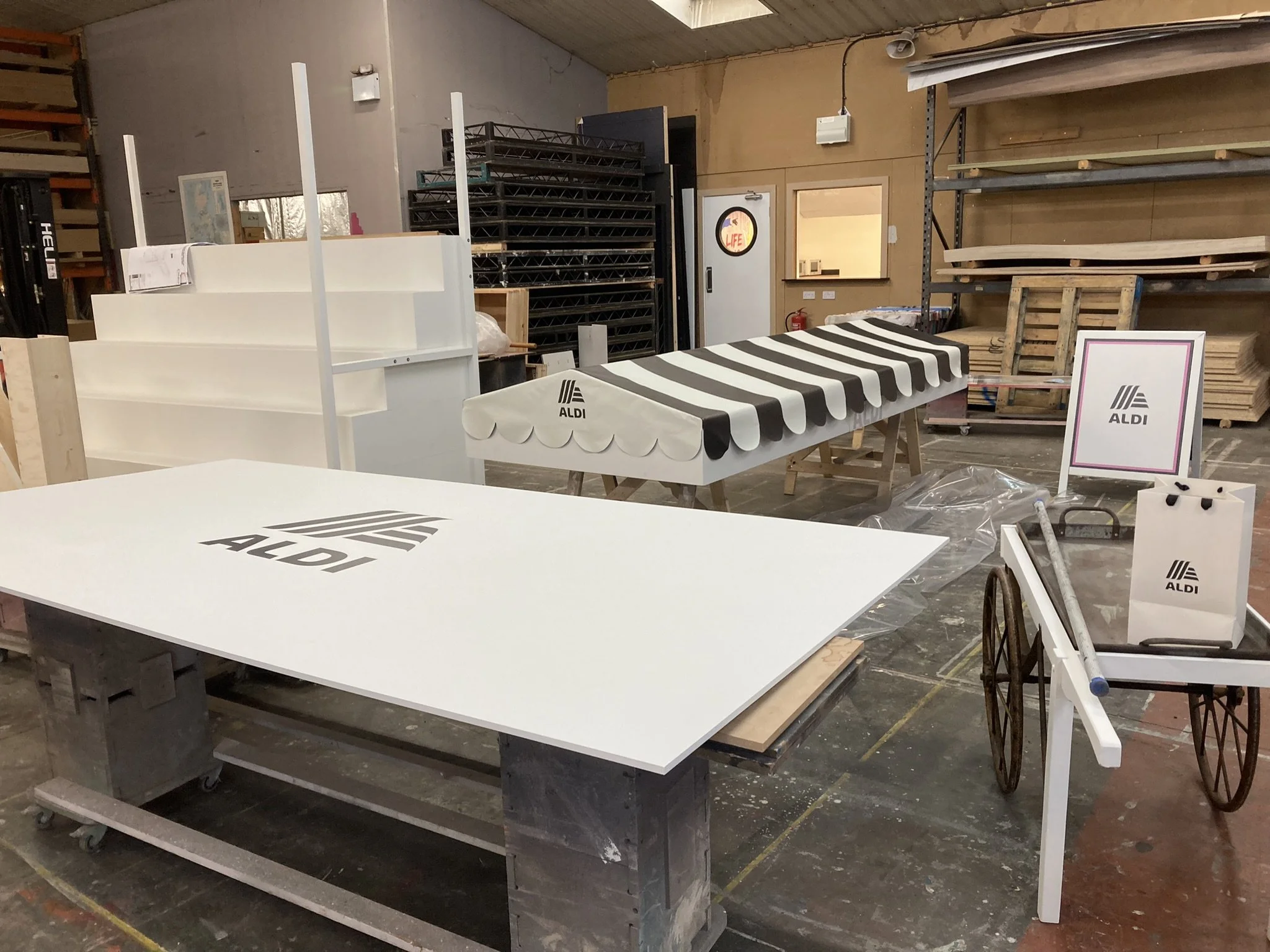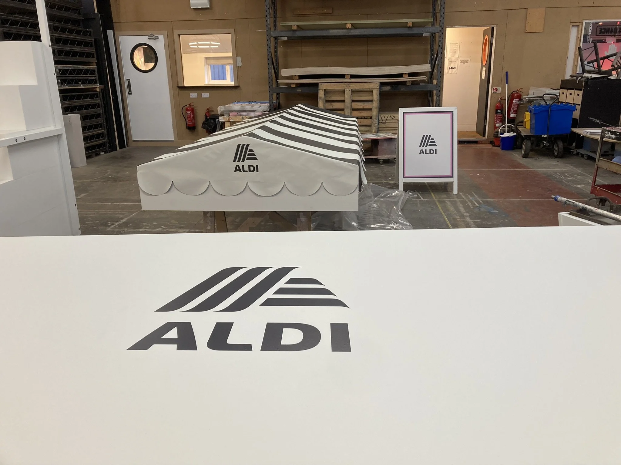 Creator fabricated and installed a tiered flower display, professionally painted in a luxurious cream finish and topped with a bespoke Aldi-branded canopy. This was paired with a vintage handcart, seamlessly colour-matched to complete the elegant setup.